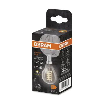 La Osram Vintage 1906 LED Classic Slim E14 Pera Filamento Chiara 4.8W 470lm - 827 Bianco Molto Caldo | Dimmerabile - Sostitutiva 40W è la perfetta sostituzione per la tua lampada convenzionale 40W con attacco E27 grazie alla sua tecnologia LED. Passare a LED ti offrirà tanti vantaggi!