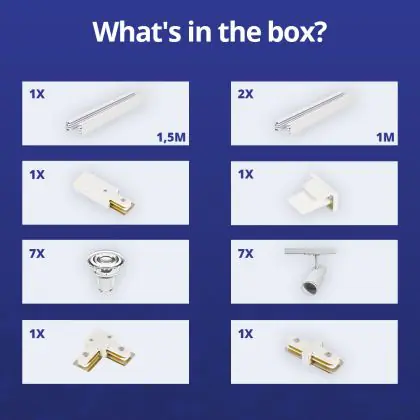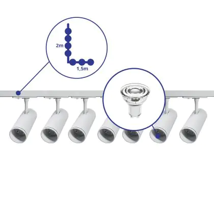 Descrizione Set completo 1-Fase Rail L 1,5 x 2 Metro Bianca | incl. 7x Faretti + GU10 2700K 3W Dimmerabile + Tappo Di Chiusura, Connettore di Alimentazione e L -Connettore